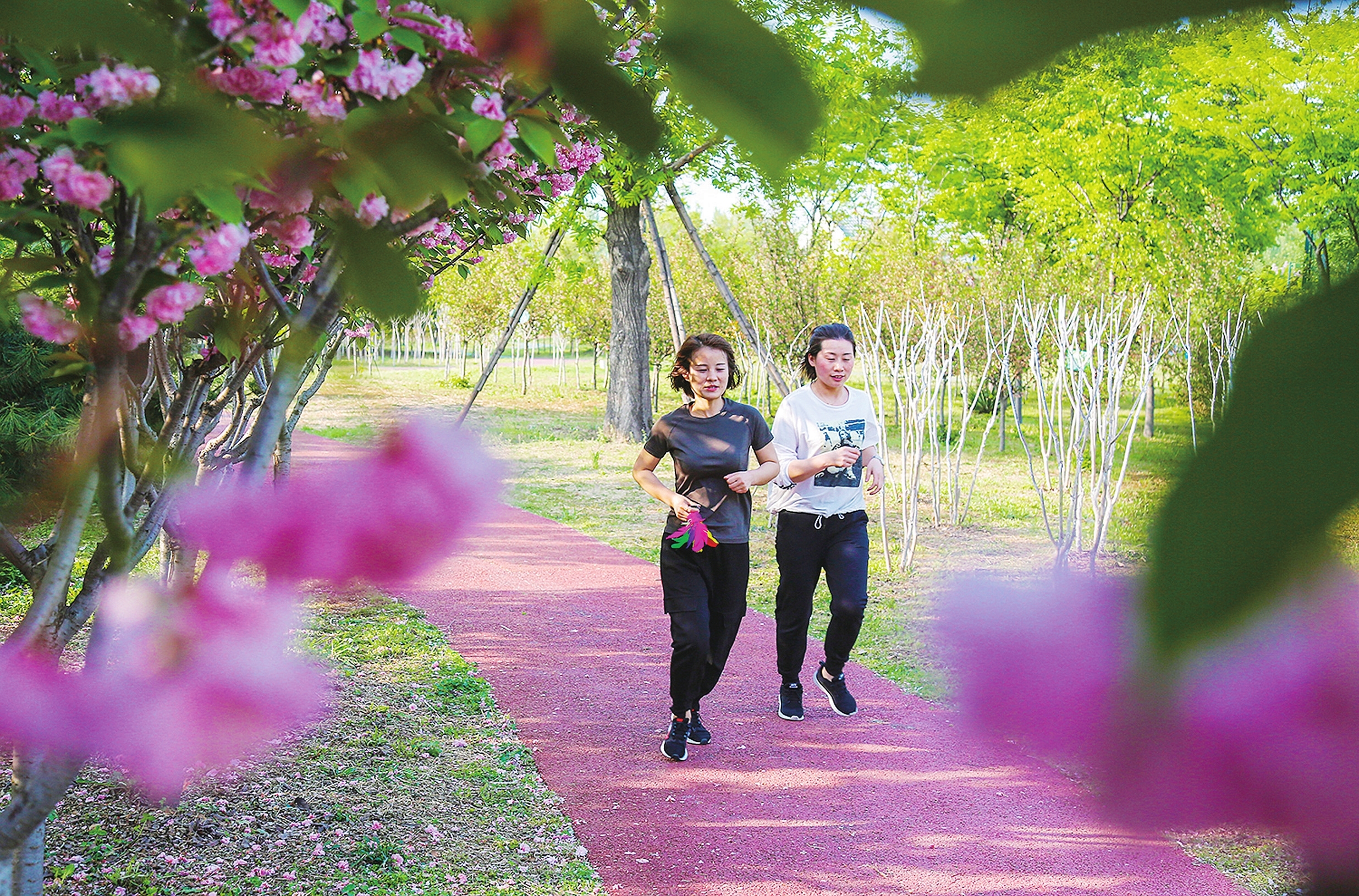 两位市民正在滕州市北辛植物园内晨跑。近年来,滕州市全面推进城市绿道景观建设,优化城市绿地布局,建成各类健身步道35千米,为市民提供绿色、开放、舒适的休闲活动空间。 (宋海存 摄)