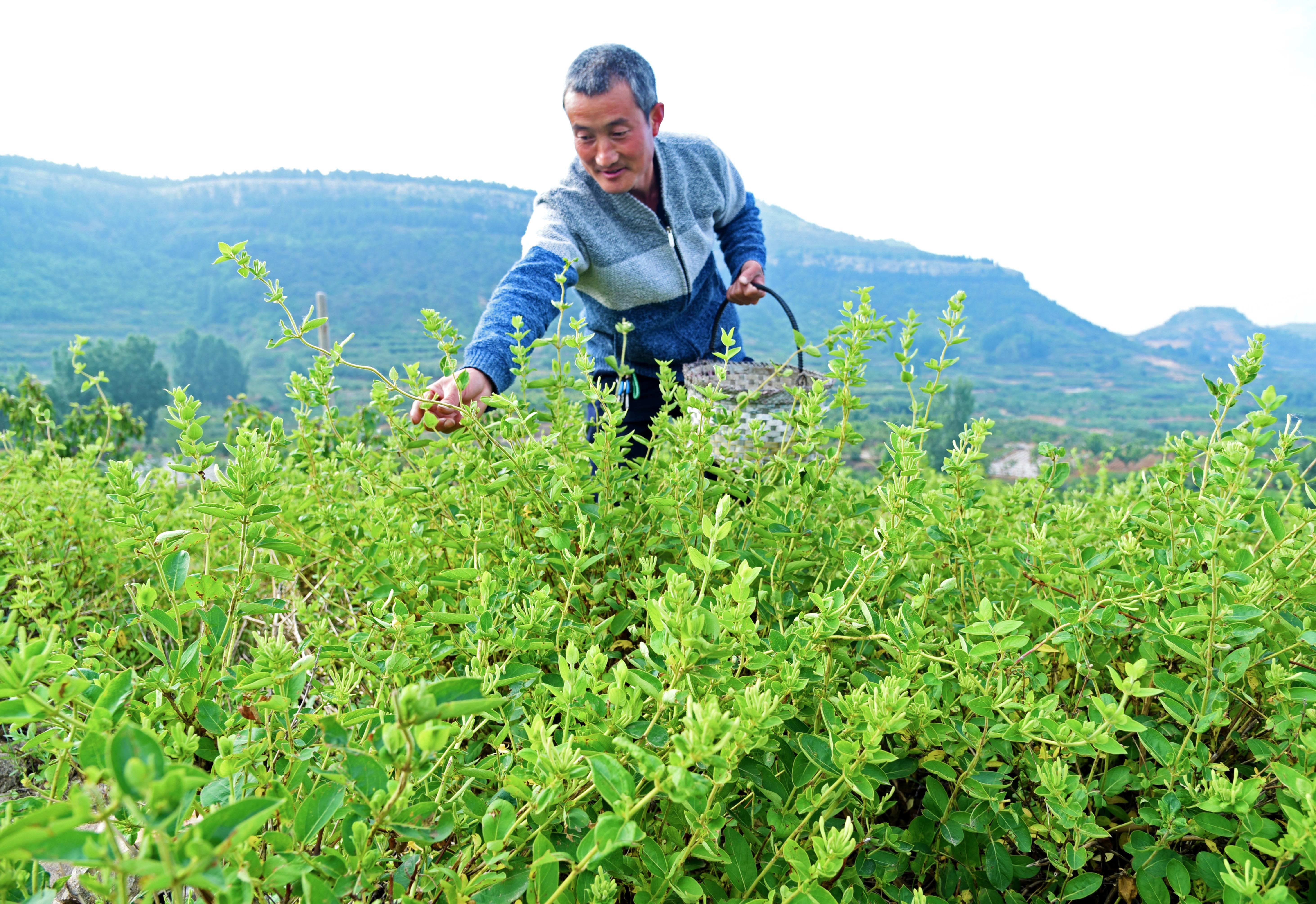 图为5月20日,水泉镇杨庄村农民在山坡采摘金银花。