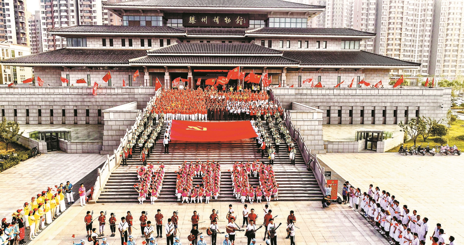 6月27日,滕州市学雷锋志愿者联合会在滕州博物馆前广场举行了“学雷锋,颂党恩,铁心跟党走,庆祝建党一百周年”大型快闪活动。活动现场红旗飘飘,歌声嘹亮,向建党百年献礼,为祖国喝彩。 (侯志龙 颜丙刚 摄)