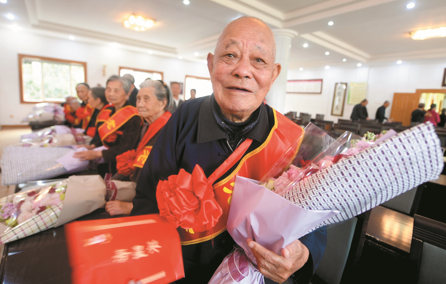 10月23日,浙江省台州市路桥区路南街道方林村97岁的村民陈友法领取“寿星奖”。