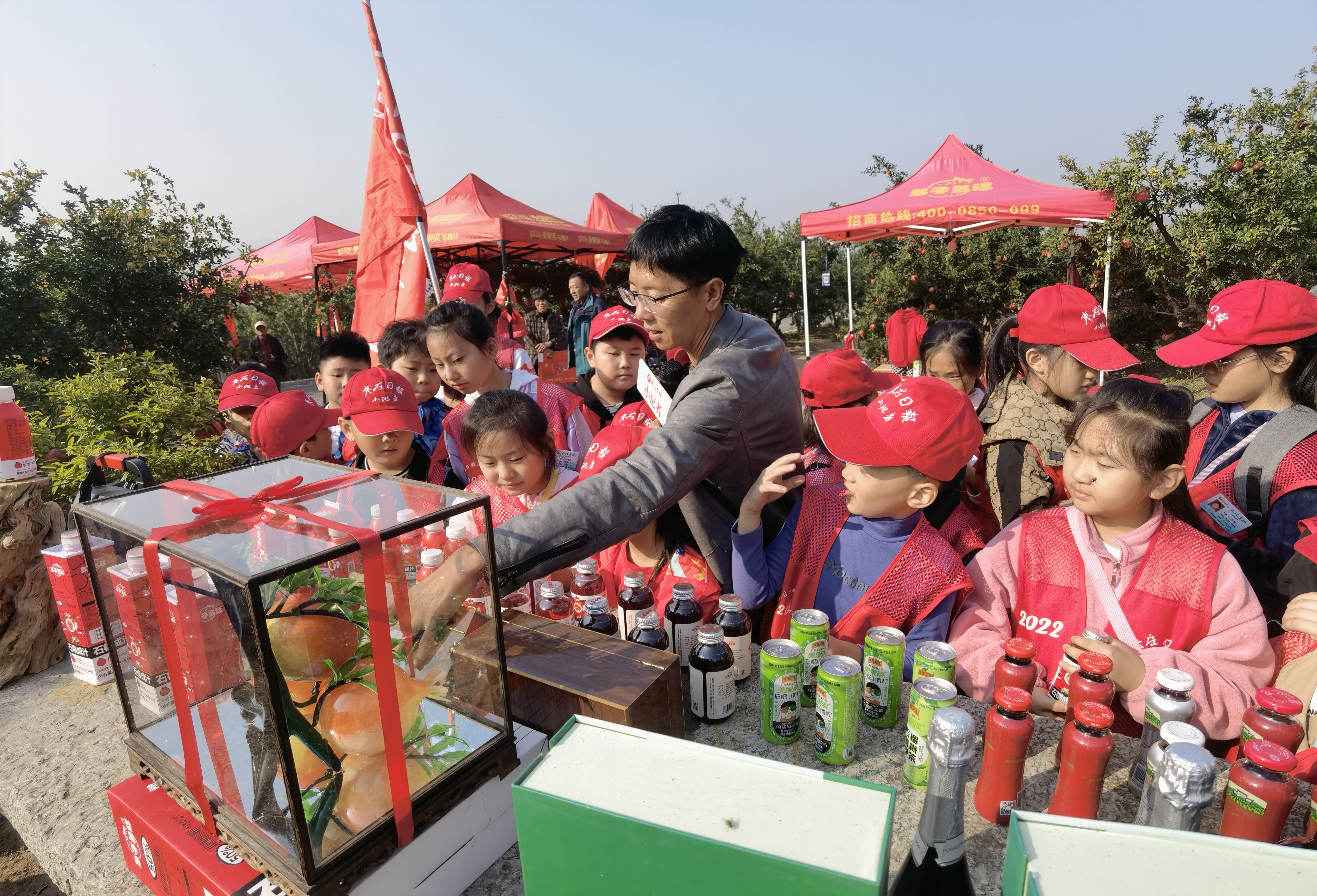 10月22日,近百名枣庄日报小记者走进峄城区榴园镇朱村村民刘远的石榴种植园,了解石榴种植历史,背诵吟咏石榴的诗句,贴近自然,感受石榴园美景与丰收喜悦,一颗颗火红的石榴挂满枝头,吸引小记者纷纷拍照留念。 (记者 单成镇 摄)
