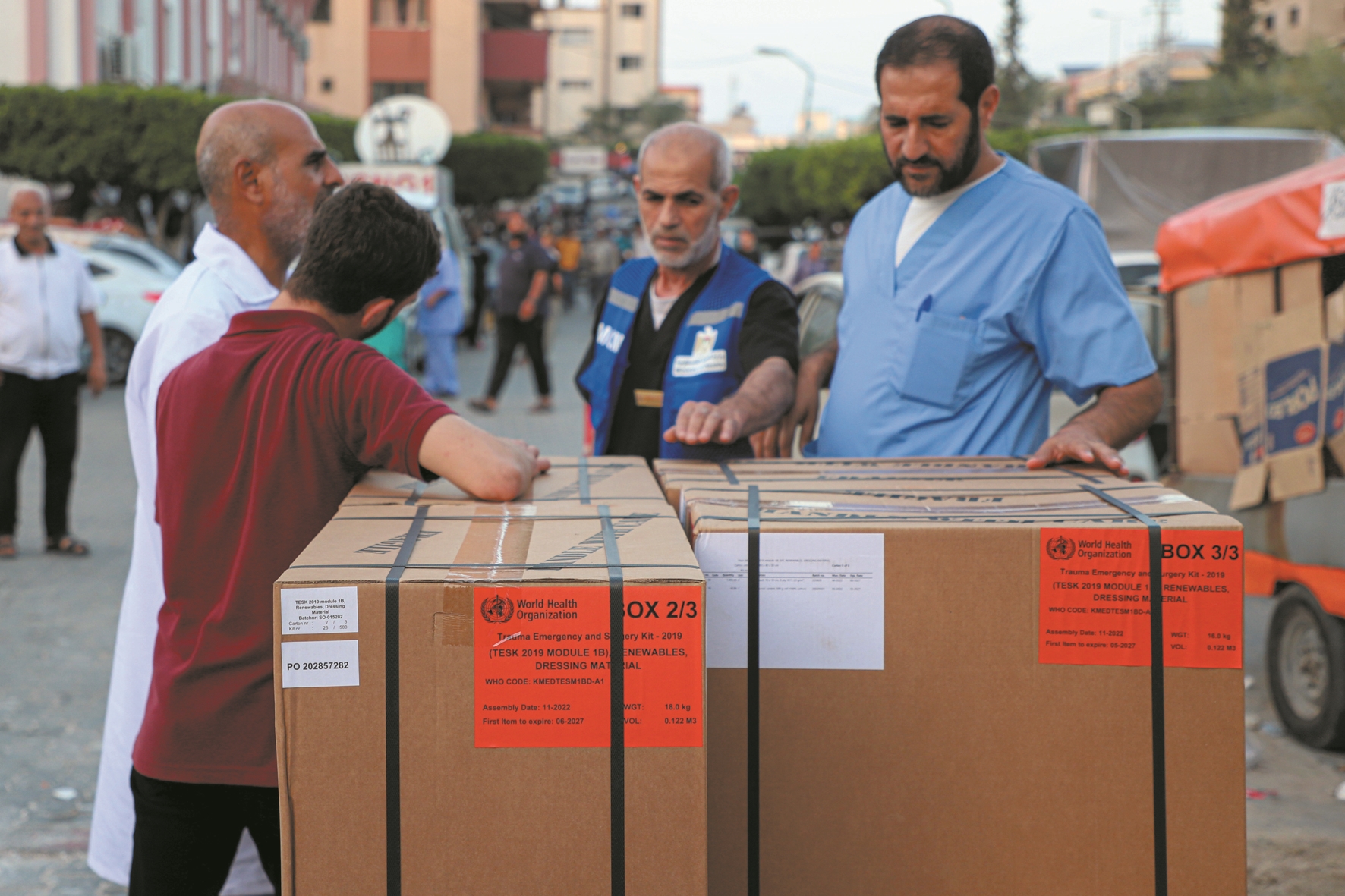 10月23日,在加沙地带南部城市汗尤尼斯,医院工作人员和联合国近东巴勒斯坦难民救济和工程处(近东救济工程处)工作人员准备转运救援物资。