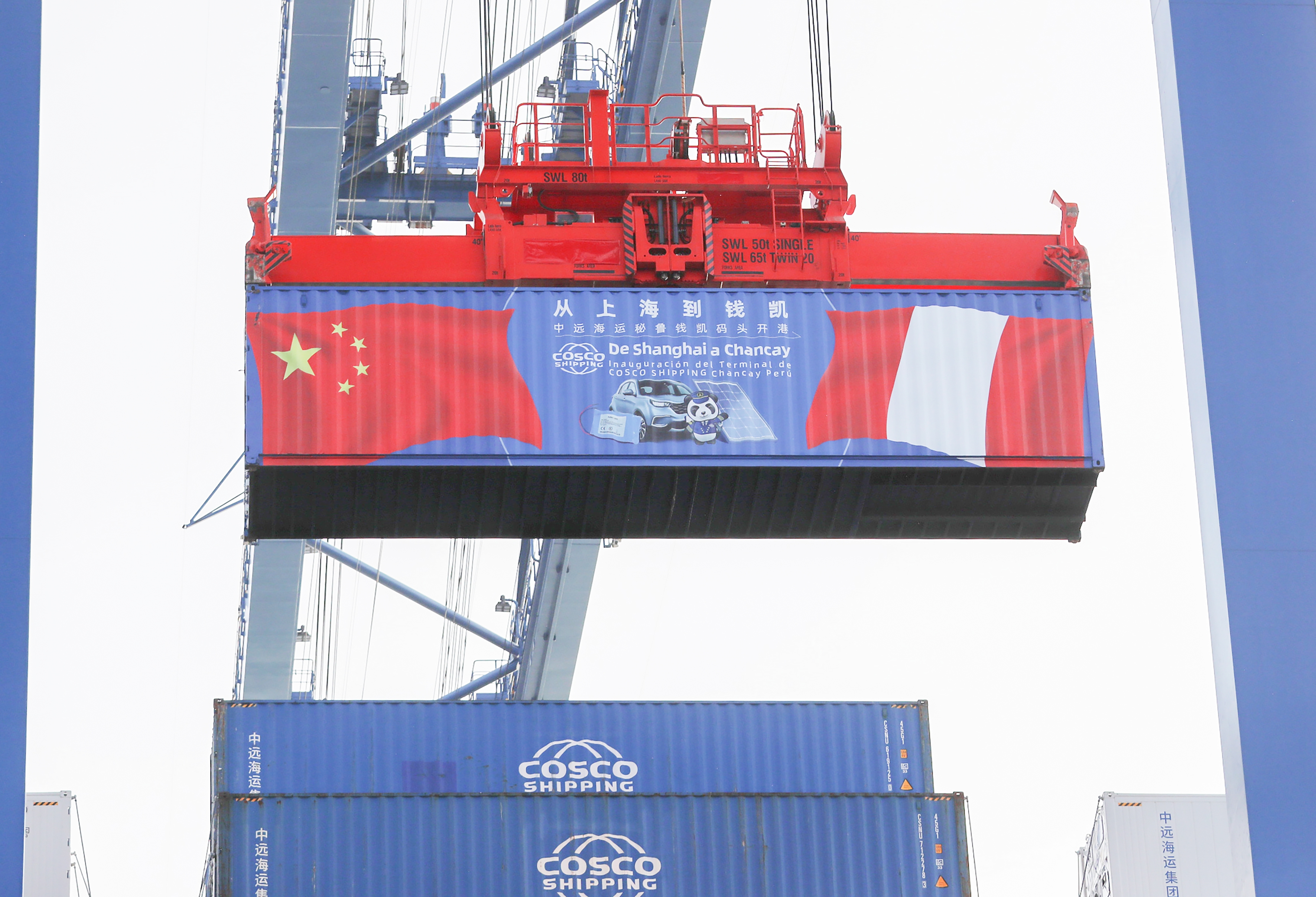 2024年11月14日,在秘鲁首都利马以北的钱凯港,岸边智能化设备吊装集装箱。 (新华社记者 李梦馨 摄)