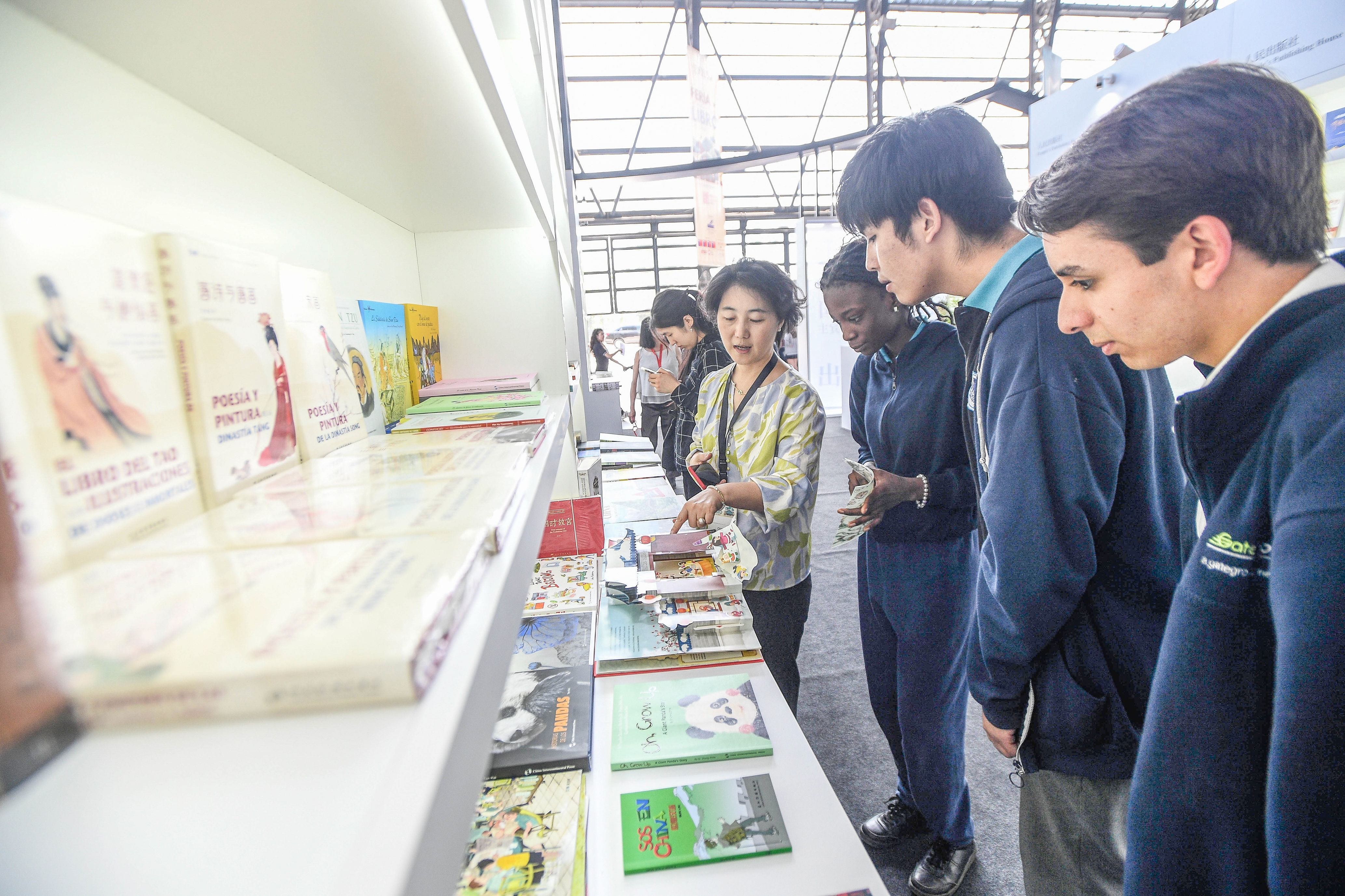 2024年11月8日,在智利圣地亚哥马波乔艺术文化中心内,当地民众在第43届智利圣地亚哥国际书展期间参观中国展区。 新华社发(豪尔赫·比列加斯 摄)