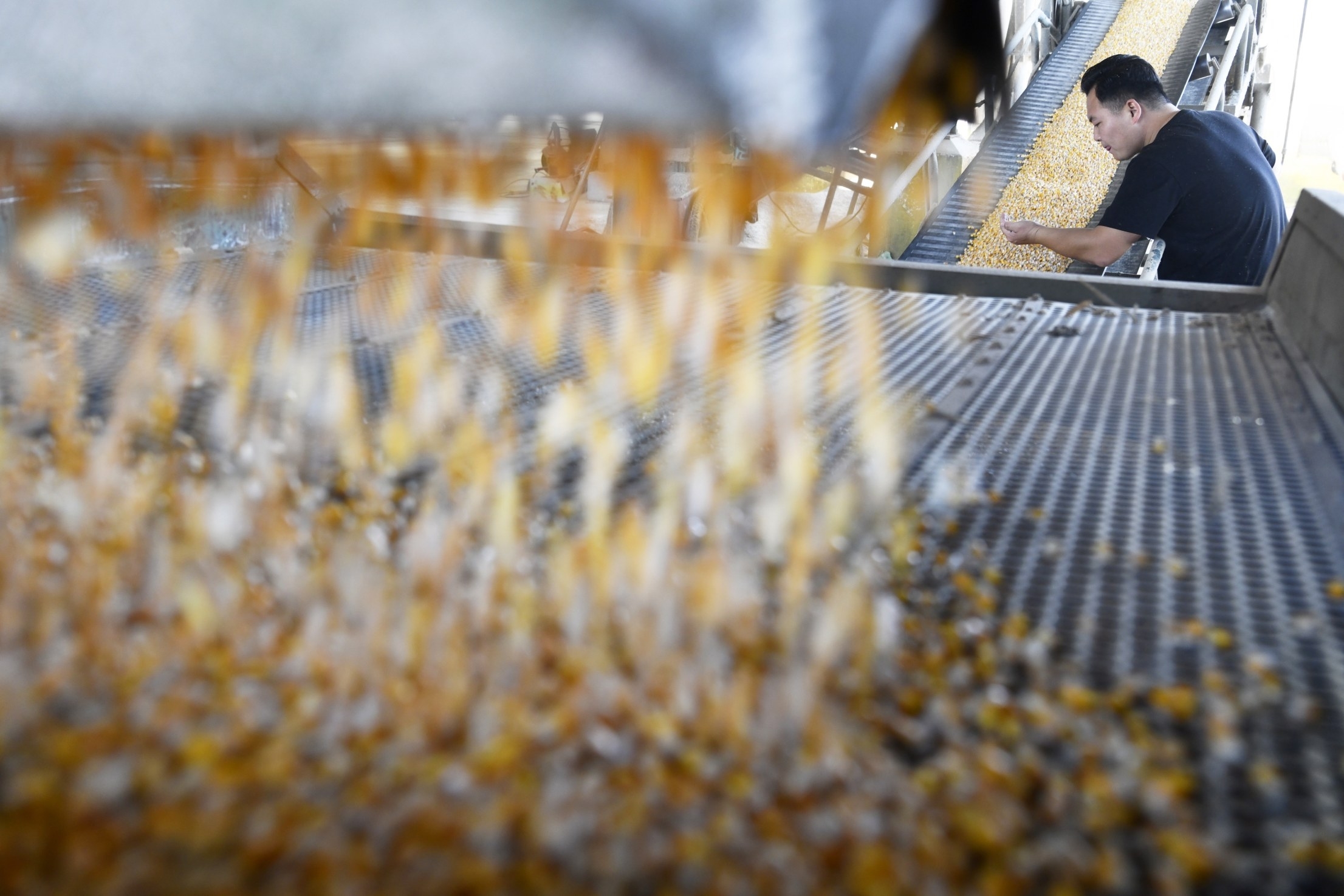 连日来的持续降雨导致部分农田受淹,玉米面临霉变风险。山亭区全力抢收、烘干玉米,一派紧张忙碌的保粮景象。 (李宗宪 陈永 摄)