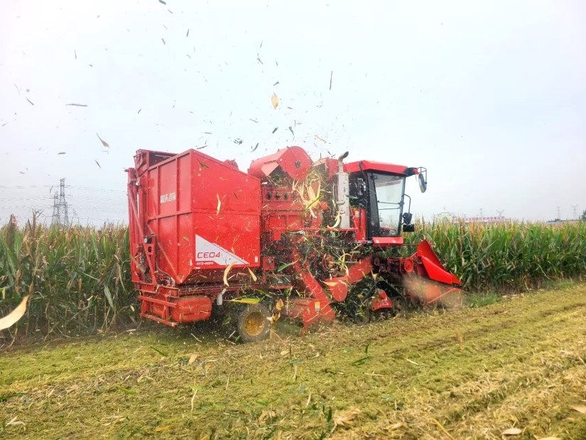为有效应对抢收压力,10月13日,山亭区城头镇长巷村履带式收割机田间抢收提升收割效率。 (李超 摄)