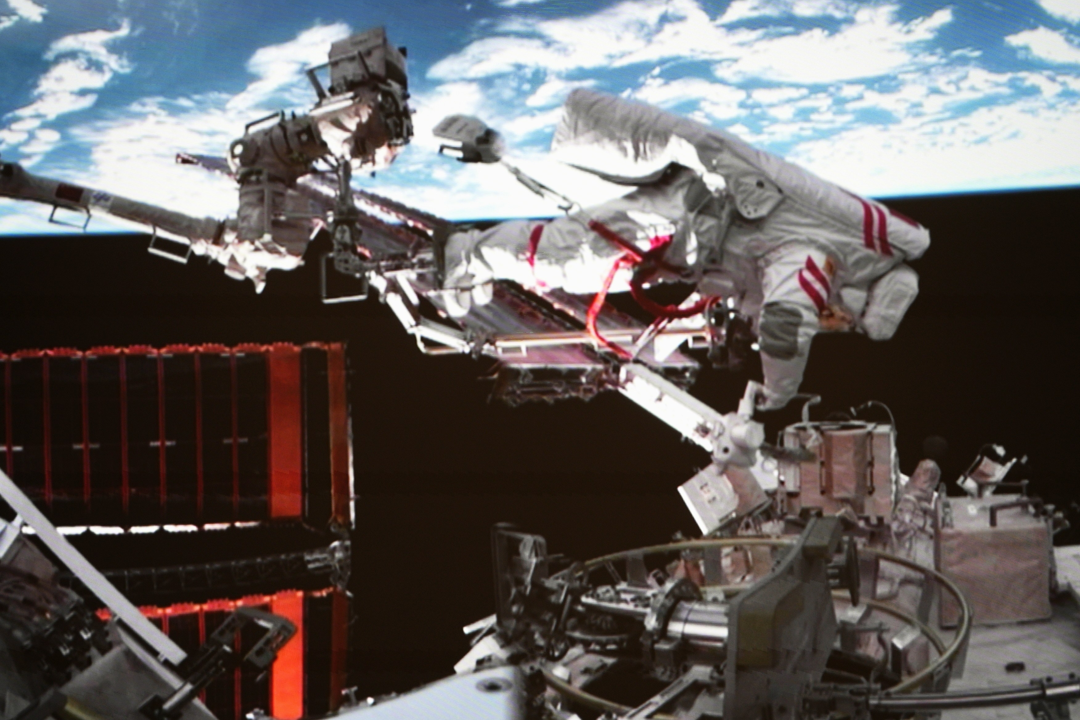 这是12月9日在北京航天飞行控制中心屏幕上拍摄的神舟二十一号乘组航天员张陆在舱外工作的画面。 (新华社记者 刘艺 摄)
