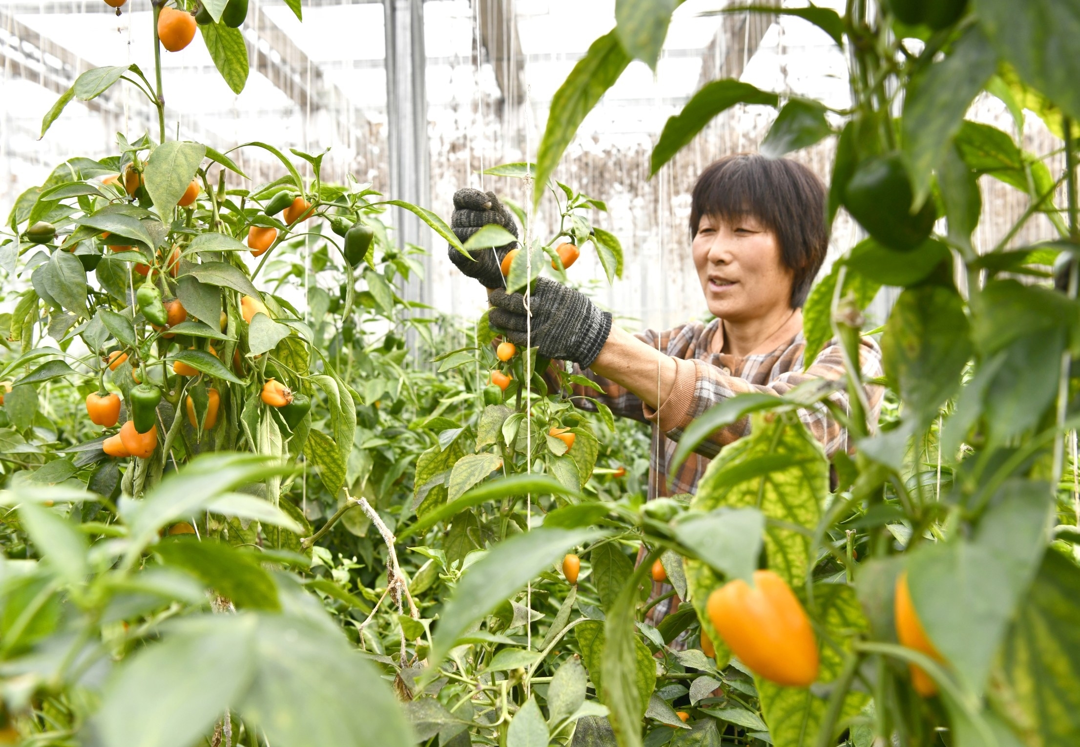 图为:徐庄镇农民在大棚内管护水果辣椒。 (李宗宪 李刚 摄)
