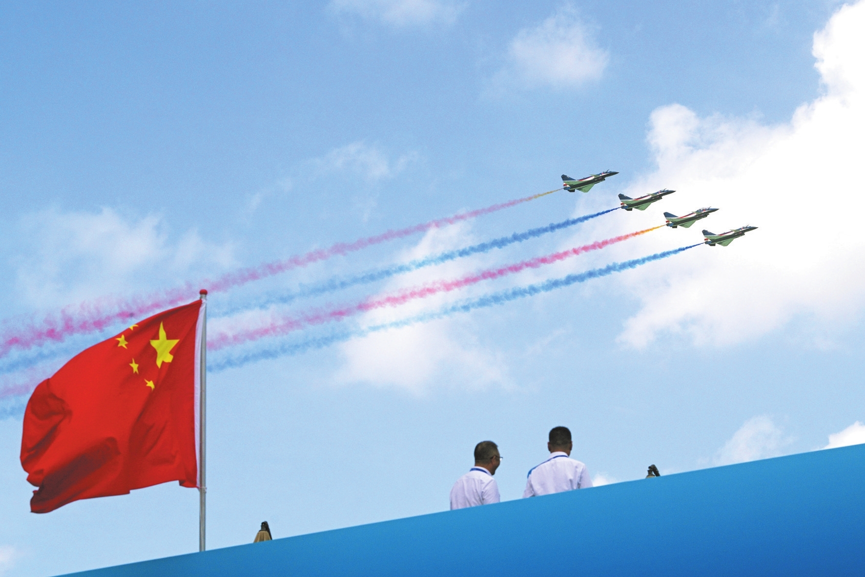 2月3日,中国空军八一飞行表演队在第十届新加坡航展首日进行飞行表演。