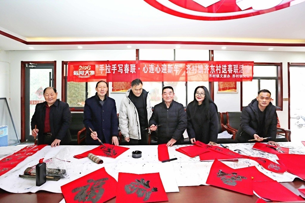 2月5日,由市中区文联、齐村镇文旅办、齐村镇文联联合主办的“2026运河大集共绘新春联·同筑幸福家”送春联活动在齐村镇齐东社区举行。书法家们现场挥毫泼墨,将带着墨香的春联和祝福送到村民手中。 (记者 孔浩 摄)
