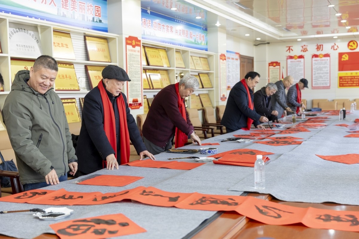 日前,瑞琴艺术馆及市书画名家一行莅临枣庄市第二十九中学,开展“迎春・送福”文化交流活动。活动现场,书画家们挥毫泼墨,一幅幅寓意吉祥的“福”字、春联及花卉、山水等画作,为校园送上新春祝福与文化滋养。 (郭庆海 闫彤 单强 摄)