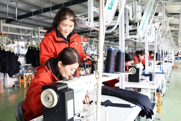 上图:2月26日,工人在山东凯奥尼服装有限公司车间加工生产订单产品。