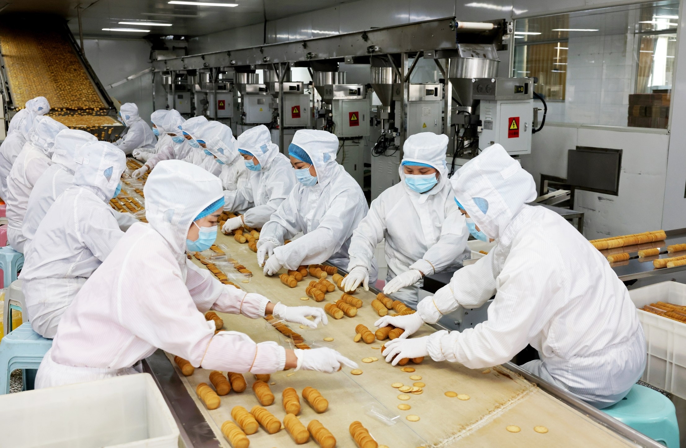 右图:2月25日,工人们在市中区孟庄镇一家食品加工企业车间内包装生产的饼干。 (吉喆 伊宁 摄)