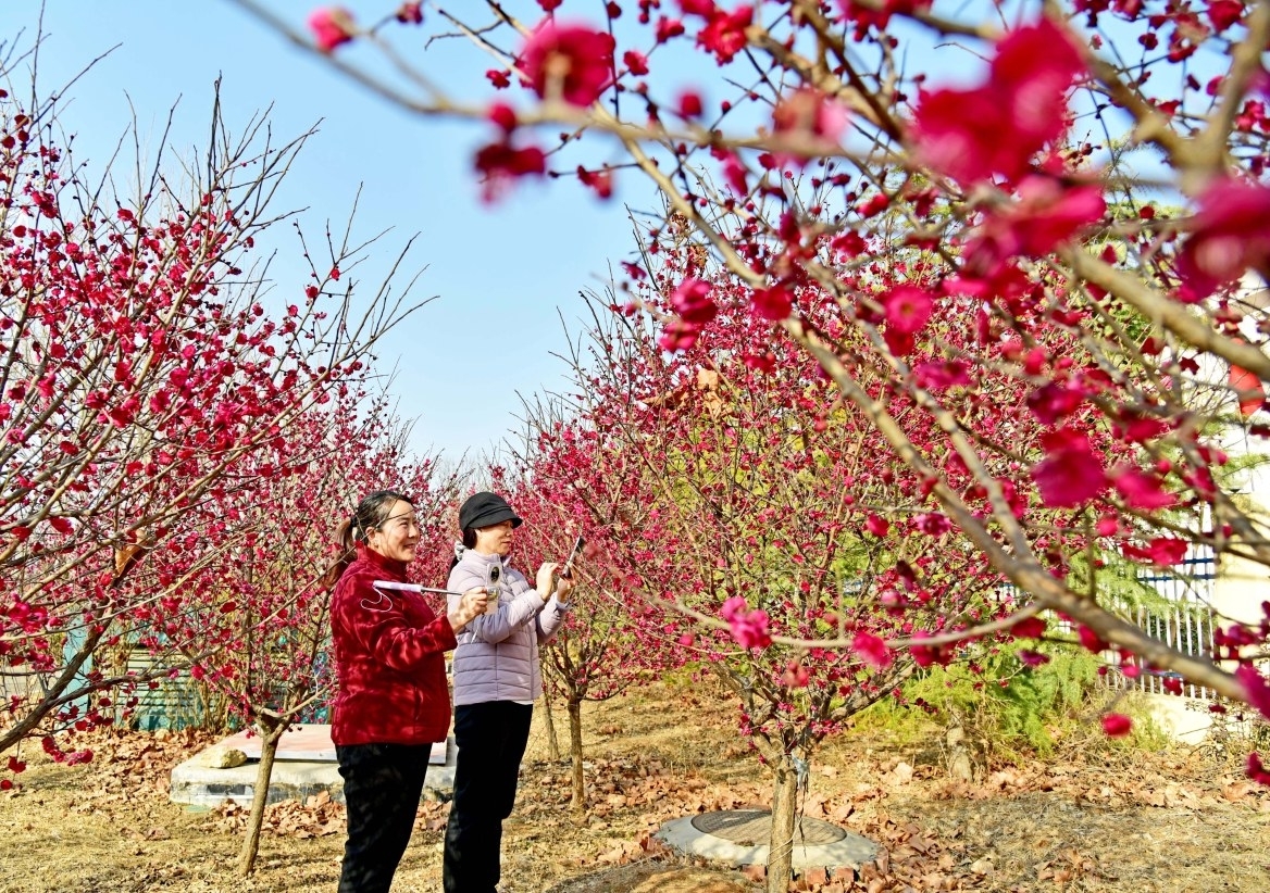 春节期间,我市公园、绿化带里栽植的红梅吐蕊绽放,吸引了众多市民前来踏青赏梅,乐享假期休闲好时光。 (刘明祥 摄)