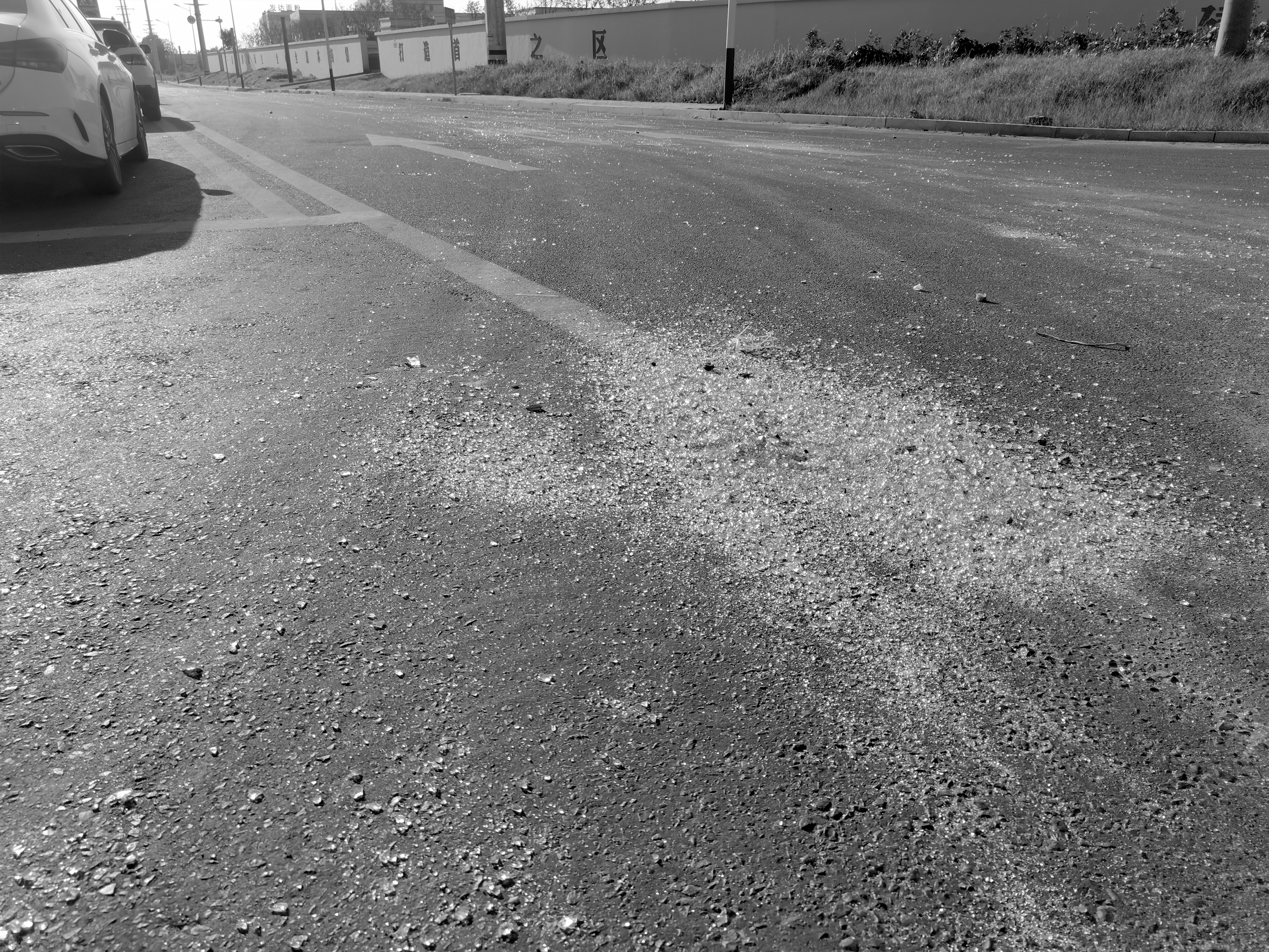 近日,在薛城区疏港路附近的马路上,玻璃碎片散落一地。